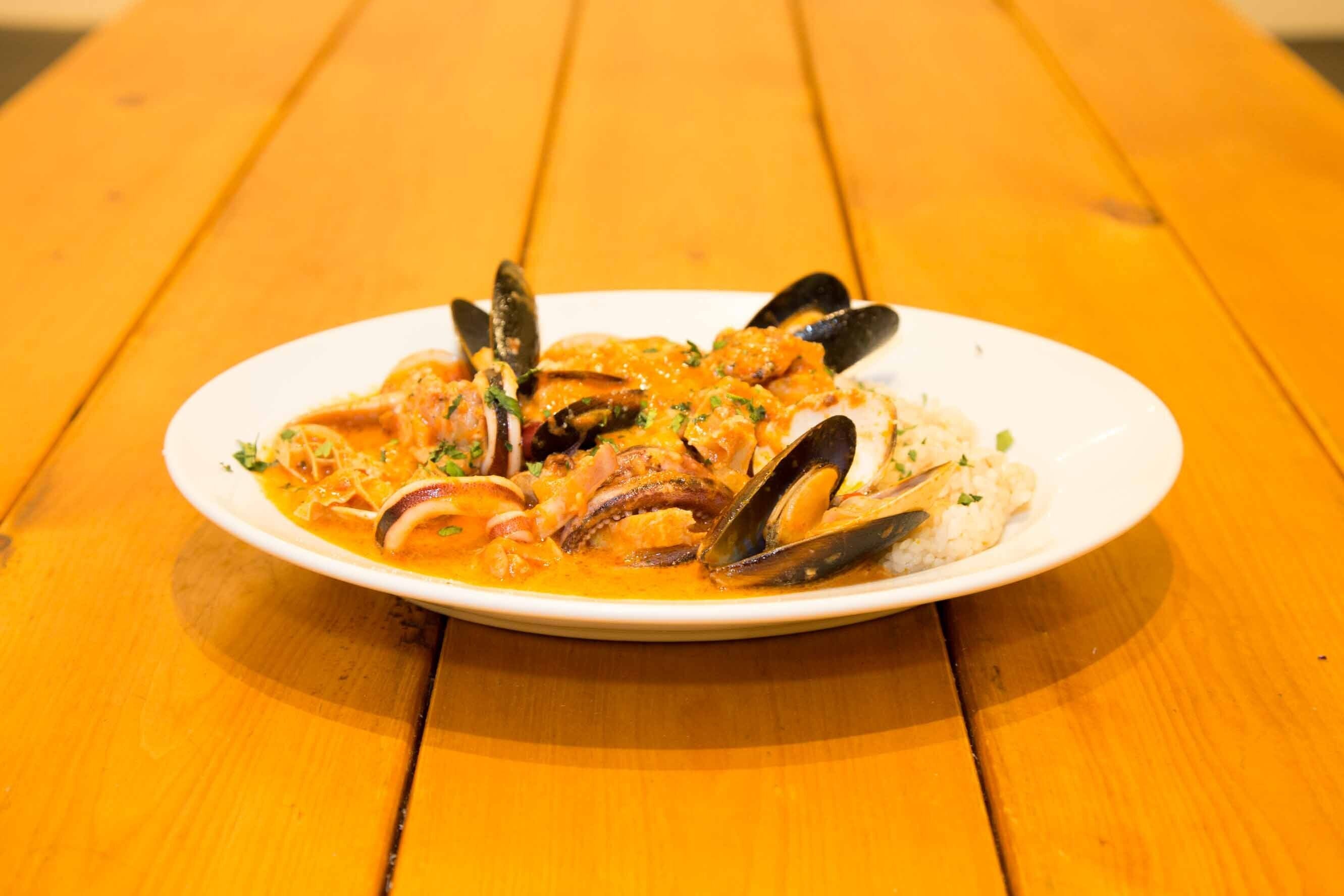 ナポリの豚モツを煮込んだ郷土料理「ソフリットナポレターナ」をモチーフに、ムール貝やイカなどの魚介とトリッパなどのモツをごちゃ混ぜ(メリメロ)に入れ、ボーンブロスとトマトで煮込んだピリ辛トマトクリームソースです。ピリッとした辛さが食欲を掻き立てる当店の人気メニューです。