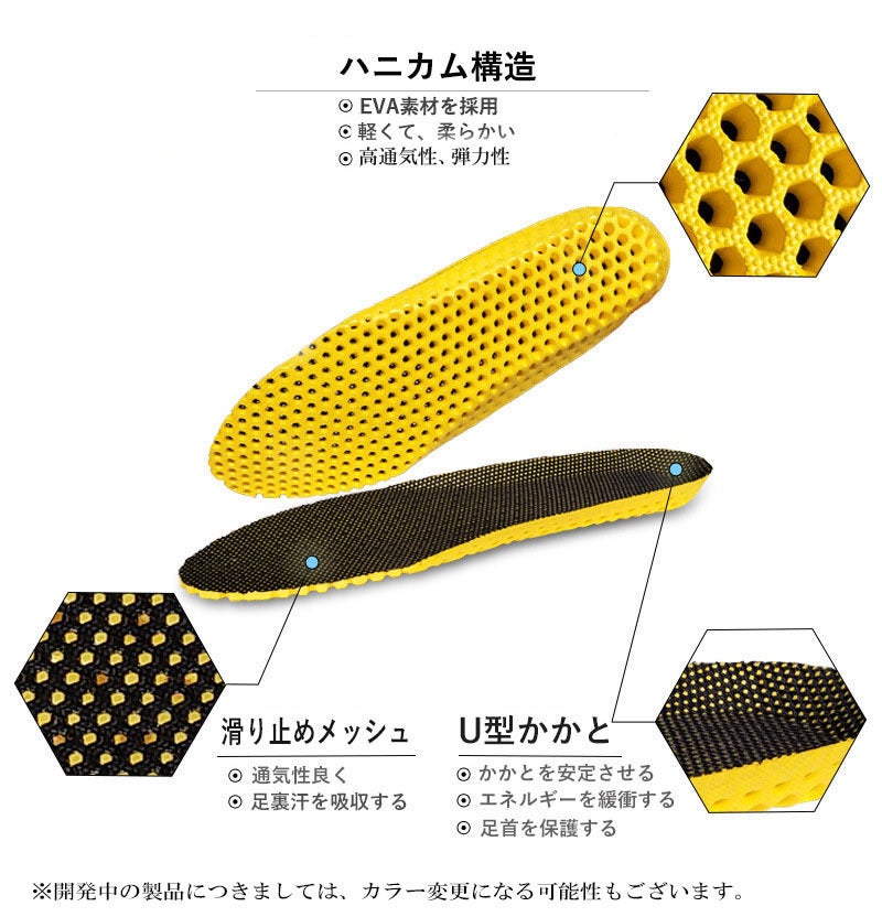 ・ハニカム構造で高い通気性と軽量化を図り、中敷きが湿っても乾きやすい速乾性素材で抗菌・防臭効果も期待出来ます。