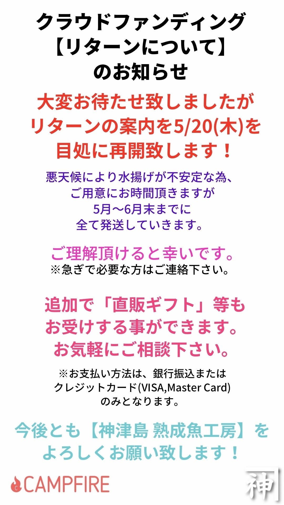 その為、リターンの発送が予定より遅延してしまい、大変ご迷惑をお掛けした事をお詫び申し上げます。