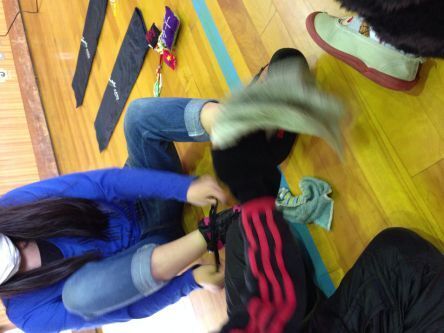 競技前の整列で、1本のロープを皆で持ち、気持ち引き締め!