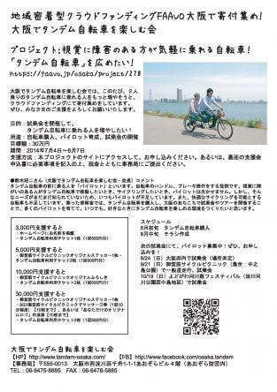 今年の9月21日(日)に開催される第7回御堂筋サイクルピクニックにタンデム自転車も参加します。 このイベントは、自転車の適正な利用と御堂筋への自転車レーンの設置を求めて2011年にはじまりました。毎年、春と秋に開催されており、大阪でタンデム自転車を楽しむ会では、第1回目から参加しています。 タンデム自転車に乗れるチャンスですよ。どうぞご参加ください。 前回(2014年4月20日)のタンデム自転車に関する記事 http://www.tandem-osaka.com/diary.cgi?no=101 第7回御堂筋サイクルピクニック ・自転車の適正な利用(ちゃんと走ろう!) ・御堂筋に自転車レーンをつくろう 2014年9月21日(日)10:00~15:00 雨天決行 場所=集合・解散/大阪・中之島公園 中央公会堂ななめ前の広場(京阪中之島線なにわ橋駅周辺) 参加/アピール走行協力金500円 *申込者優先で素敵なオリジナルグッズがもらえます *アピール走行参加者にはもれなく豪華景品が当たる抽選券あり 歩行者も自転車も安心して通行できる環境づくりを目指して、 御堂筋を自転車でアピール走行します。 大阪市内初の自転車レーンがある「本町通」も通ります。 メイン会場では、「自転車マーケット」「ランチ・カフェ」 「自転車ルール教室」「自転車試乗会」 などでお楽しみください。 イベント一覧 (予定)*7/9時点 アピール走行 10:30~11:00(受付10:00から) 青色アイテムをつけて、みんなで御堂筋を走ろう! 【走行ルート 約5km:中之島→御堂筋→長堀通→堺筋→中之島】 *参加は中学生以上 *2周目は本町通を走ります 自転車マーケット 10:00~15:00 自転車雑貨、パンク修理・メンテナンス講座、インドアバイク体験レッスン ランチ、ドリンクなど、お気軽にお立ち寄りください! 自転車ルール教室 10:00~15:00 初めての車道走行、ルールや走るコツ、ヘルメットの安全性、自転車クイズなど。 自転車試乗会 12:00~15:00 ハンドサイクル、タンデム自転車など珍しい自転車や、スポーツ自転車に試乗できます。 抽選会 14:30~15:00 自転車関係グッズなど豪華景品があたる抽選会 アピール走行に参加するには? 「氏名、当日の連絡先」を明記の上、 なるべく事前にメールか、申込フォームよりお申し込みください! *締め切りは9/17(水)。当日参加も可 ママチャリでもロードバイクでもミニベロでも、 どんな自転車でも参加可能です(ただし中学生以上)。 アピール走行・試乗会に参加される方は、安全確保のため、 ヘルメットをお持ちの方は着用をお願いします。 レンタサイクル アピール走行、ピクニックツアーに参加する人は、会場で自転車をレンタルできます。 【大阪コミュニティサイクルCOIDECO】http://coideco.jp/ 料金=500円/台 受付=メイン会場(大阪・中之島公園) 時間=イベント開始から終日お使いいただけます。 なお、イベント終了後は市内のCOIDECOポートに返却ください。 申込=下記事務局まで、氏名、連絡先、人数をお知らせください。中学生以上。 締め切りは9/17(水)。 お申し込み・お問い合わせ サイクルピクニッククラブ事務局(あおぞら財団内) 大阪市西淀川区千舟1-1-1あおぞらビル4F メール: webmaster@aozora.or.jp 電話:06-6475-8885(10:00~17:30) ホームページ:http://cycleweb.jp/cyclepicnic ※イベント中におこった事故、盗難、損失、損害について、主催者は一切責任を負いません。 主催:自転車文化タウンづくりの会 企画・運営:御堂筋サイクルピクニッククラブ