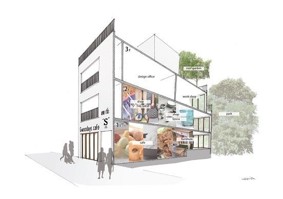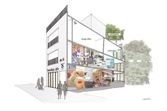 僕らが借りたビルは細長く、表のとおりから、裏の公園から、両方行き来できる奥行きがあります。3階建てで、4階が屋上です。それぞれの階に大きな窓やテラスもあり、開放感あふれるビルです。このビルに業態の異なるお店にはいってもらい、それぞれが定期的なイベントを開催し、1日中楽しんできただけるようなつくりにしたいと思っています。