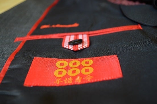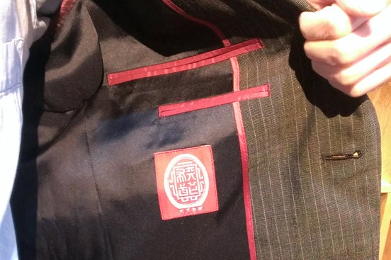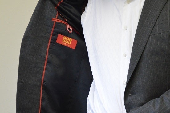 ▲不惜身命織ネーム 裏地は黒で赤の線をあしらい真田幸村カラーを演出。ネームは幸村スーツ専用に真田の六文銭と不惜身命の文字をいれた特別ネームで制作しています。