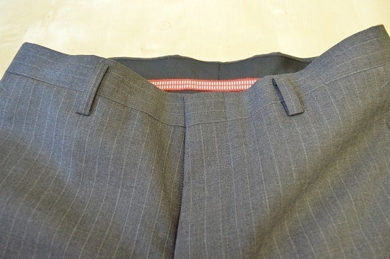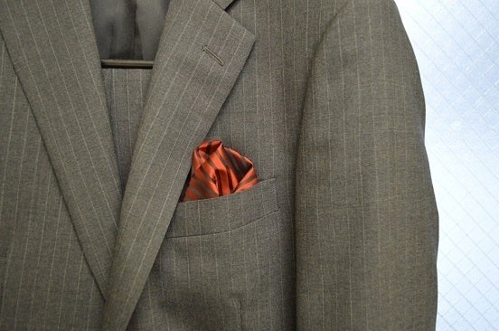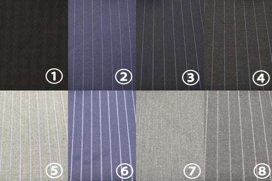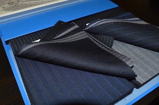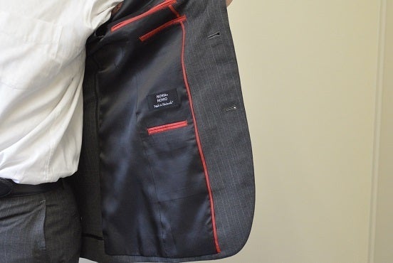 ▲生地見本 今回はサンプルをグレーストライプの生地で制作していますが、店頭でお作りいただく方にはオーダーメイドで、表地から各種オプションまで選択いただき制作いたします。黒の表地で赤のステッチを入れるもよし、グレーの生地でお作りするも良し。株式会社NFLが運営する紳士服・礼服のお店「ノービアノービオ」で採寸の上、生地やオプションをお選びいただいて制作いたします。お好みのスーツ作りを是非お楽しみください。