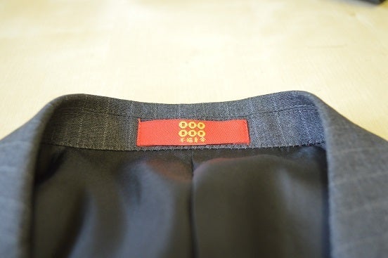 ▲幸村スーツ限定仕様のオリジナル織ネーム仕様 ネックのネームにも六文銭と不惜身命のネームを使用。ハンガーで吊っていてもかっこよく見える様にデザインしています。