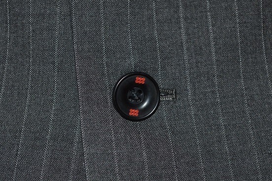 ▲真田幸村のイメージである赤をコントラストにあしらい、ジャケットの内ポケットの留め具、パンツの内側のすべり止めに真田紐を使用 真田幸村の旗印である六文銭(もしくは「六連銭」)は、亡くなった人を葬る時、棺に入れる六文の銭の事で、三途の川の渡し賃のことである冥銭を表しています。これを旗印にすることは「不惜身命」(ふしゃくしんみょう:仏法のために身命をささげて惜しまないこと)を意味するといわれています。今回の真田幸村スーツには、真田の六文銭と不惜身命をネームやボタンに取り入れて制作しました。