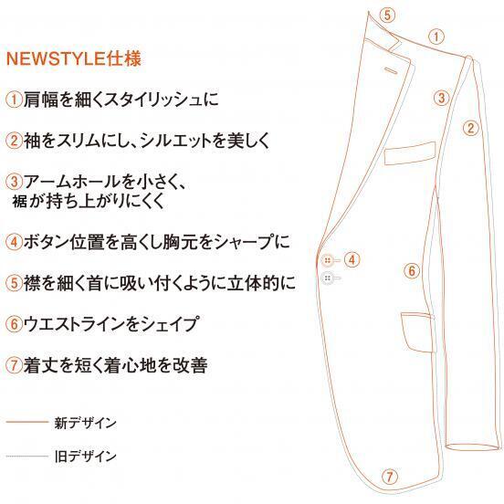 今回幸村スーツのサンプルで使用した型紙はNFLが新しく開発した新型紙です。現在主流の「肩幅」を小さくし、肩パットを薄くしたソフトなジャケットになっています。アームホールを縦楕円ではなく、横楕円にし、肩を上げても脇の生地が釣られて引っ張られないデザインになっています。衿も首に吸い付くように付け、ジャケットの重みが首と肩とバランスよく、かかるようにして、ジャケットの重みを感じさせなく、肩の凝らないジャケットになっています。「組下(ズボン)」はノータックの細身で、膝位置が高く、脚長効果があるデザインです。おしりに食い込みがなく、3D立体的な構造になっています。 こちらの型紙を使って、今回の幸村スーツを制作いたします。 ※その他の型紙(デザイン)も多数ご用意。ノービアノービオにご来店の方は、その他の型紙もお選びいただけます。既成品はこちらの型紙使用したものとなります。