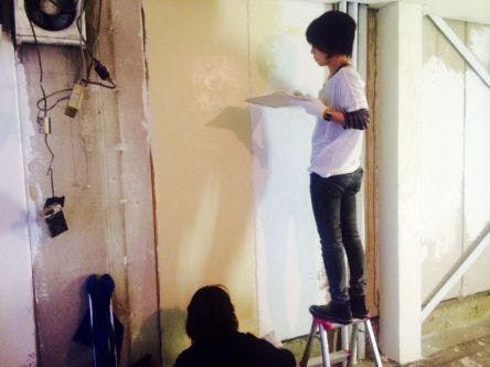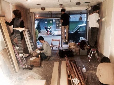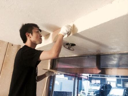 午後は、コアプラスの印刷物のデザインをいつもお願いしているグラフィックデザイナーのさえちゃん、「興味本位で〜」と来てくださった別府さん、もはや頼りにしまくりの山本さん、皆勤賞のあっちゃん、大学のレポートを終えて合流してくれたco-arc住人のうのちゃん、というメンバーで漆喰の本塗り!