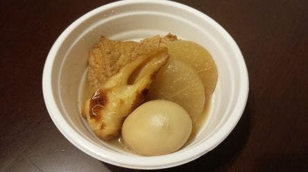 おでんは、地元の食材店さんの伏見屋さんの厚揚げ、山下蒲鉾店さんのちくわを使って、作ります。