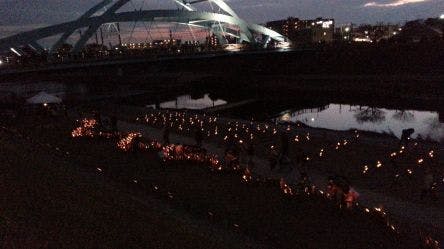 夜になり、竹灯籠に火を灯すと、暗かった河原は暖かい明りで照らされ、別世界のようでした。