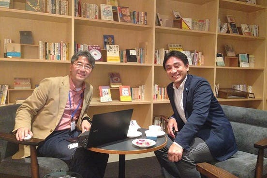 ▲左:まちライブラリー創設者の礒井純充さん 右:起案者の川辺友之
