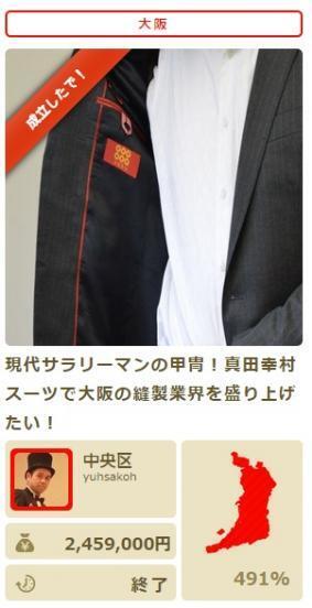 2014年5月には投資型のクラウドファンデイング「ミュージックセキュリティーズ」にて自ら「大阪谷町復活スーツファンド」を立ち上げました。結果、5店舗目の設立費用「約1500万円」を調達することができ、家業を立て直すことができました。