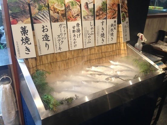 お客鯖と「とろさば」がコミュニケーション出来る企画。お好きなサバを選んで頂き、1g3.8円で販売!8種類の料理の中から、お好きな料理を2品まで選んで頂き、その場で調理をします。