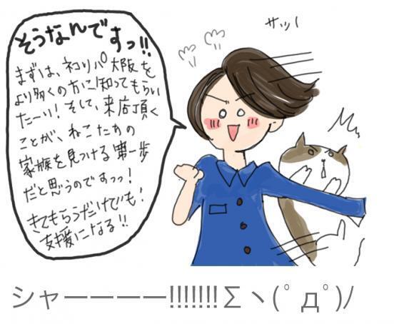 だから、なんか、ネコリパ大阪にいっぱい人きてもらって、あたしの仲間たちが、サトオヤとかいうものをゲットするためには、めっちゃたくさんのニンゲンに足しげく通ってもらわないかんやん。