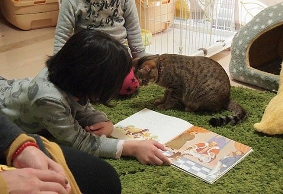 ◯アメリカペンシルバニア州で施設にいる保護猫たちに、地元のこどもたちが絵本を読み聞かせるというリーディングバディという取り組みが行われています。ネコにとっても子どもたちの読み聞かせの声の音やリズムは「癒し」になっているそうです。しかしネコはネコ。すぐに飽きてウロウロしたり、警戒して寄ってこないなど様々です。それでも、回を重ねていくことで心傷ついた猫たちに、人間の声とそのぬくもりを知ってもらえます。また、子どもたちが猫と触れ合うことで、情操豊かな心を養う経験ができる、ネコにも子供にも優しい取り組みです!