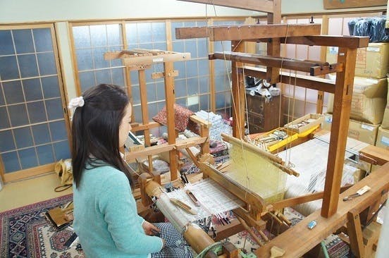 ▲アンドスクエアの工場。機織り機で帯を作っています。