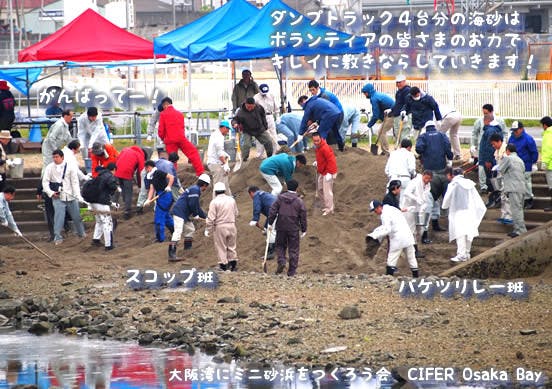その活動は平成26年4月にスタートし、大阪湾環境再生研究・国際人材育成コンソーシアム(略称:CIFER Osaka Bay)の応援サポーター会費を活用してダンプトラック4台分の海砂を購入し、ボランティア86名のご協力で、岩やガレキをとりのぞき、周辺の美化清掃を行ったうえに、きれいに海砂を敷き均しました。