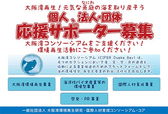 大阪湾環境再生研究・国際人材育成コンソーシアム(略称:CIFER Osaka Bay)を運営しているCIFER・コアからのお願いです。CIFER Osaka Bayでは、環境再生の活動に応援するサポーターを募集しています。