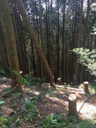 間伐は天然林のブナ林ではなく、ブナ林のすぐとなりのヒノキ・スギの人工林です。