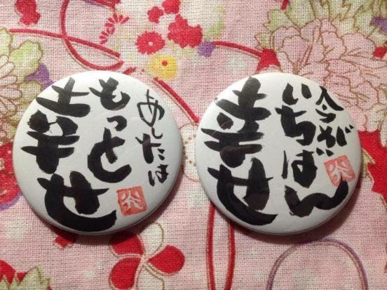 例えば、交流会では、缶バッジを作られている作家さんと、筆文字作家さんとのコラボ商品が生まれました。実際の商品がこちらです。