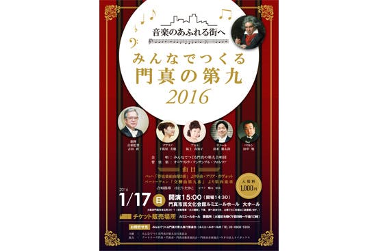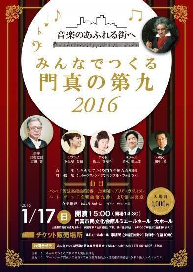 そこで、「門真の第九」はこの街で暮らす人がこの街の市民であることを誇りに思える街をつくること、この街のイメージアップを図ることを、開催する目的として掲げることにしました。 この想いは多くの人に伝わり、門真市、門真市教育委員会、門真市音楽協会、NPO法人トイボックスからご協力をいただけることになり、ついに2016年1月17日(日)、初めて私たち実行委員会による「音楽のあふれる街へ みんなでつくる門真の第九 2016」を開催できることになりました! 多くの市民の取り組みや基本方針に基づく様々な施策により、門真市の文化芸術環境が少しずつ良くなりつつある今!さらによい街になるように「門真の第九」を開催します!