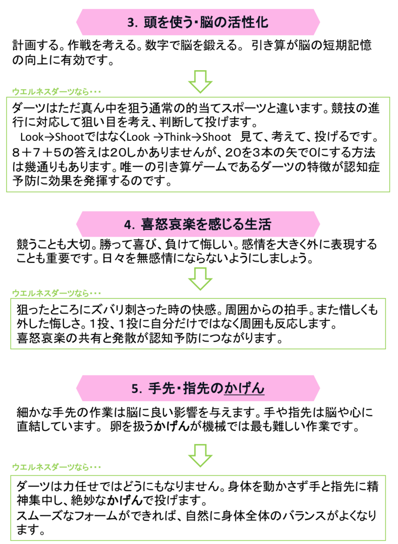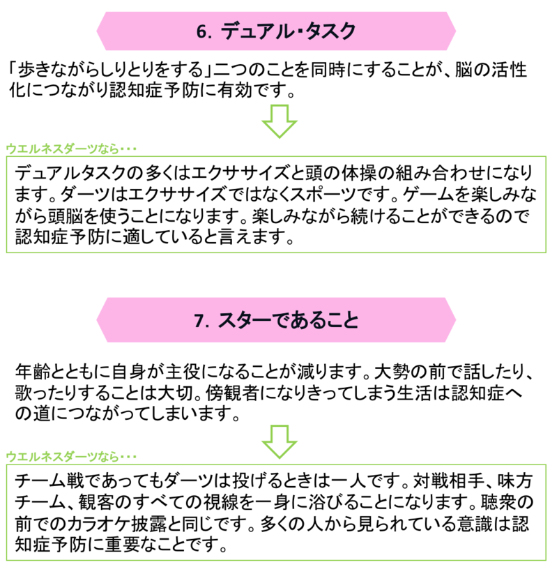 この段階で集中力・計算・戦略を必要とするダーツが認知症の予防と改善に大きな効果があると考えられます。加えて適度な運動、手足指先の加減運動、他者との交流、なにより楽しみながら続けられるという利点があります。