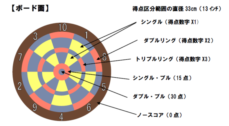ダーツは弓道やピストル、アーチェリーなどの的当競技の一つではありますが、他の射的スポーツと違い中央を狙うだけではありません。必要に応じてボード面のあらゆる得点を狙わないといけません。そして得た得点を持ち点(501点)から引いて最終的に0にする唯一の引き算ゲームです。(減点ゲームではありません)