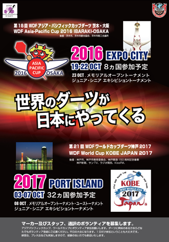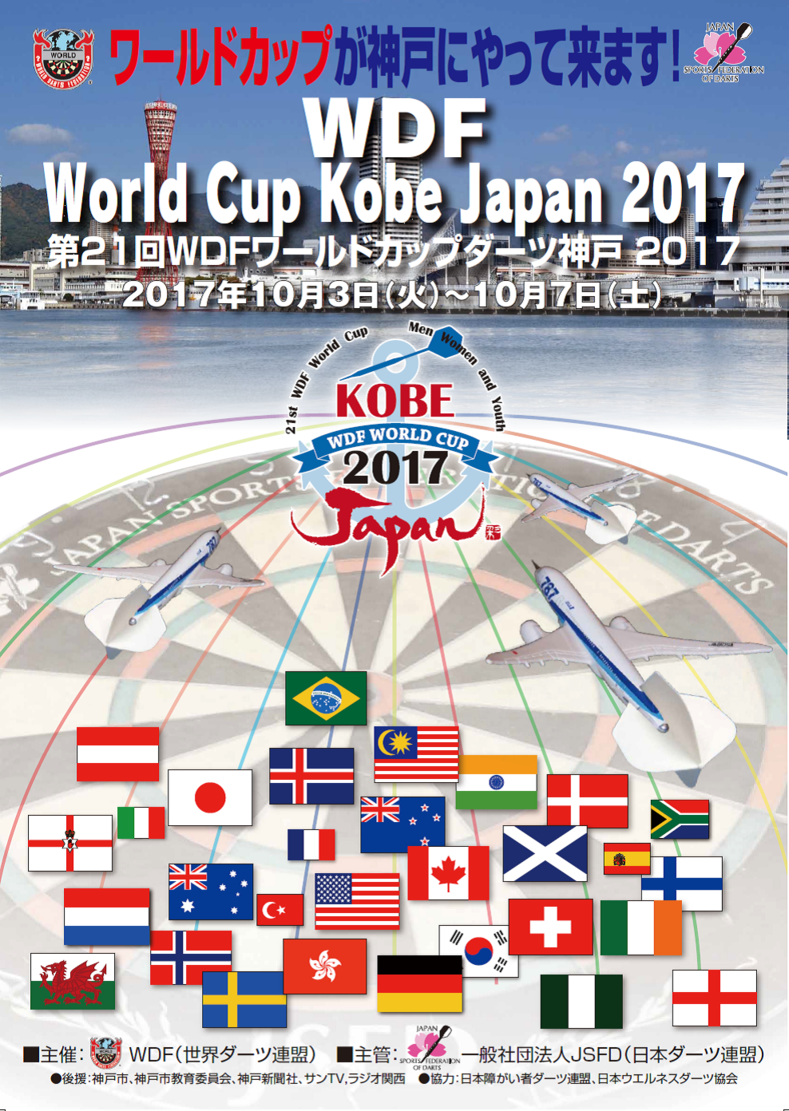また神戸開港150周年にあたる2017年10月には神戸で世界32ケ国が集まり第21回のWDFワールドカップを開催します。日本ダーツの歴史的な2年になります。世界各国のトップ選手が国旗を背負って戦います。興味のある方はぜひこの機会にダーツの醍醐味をお楽しみください。