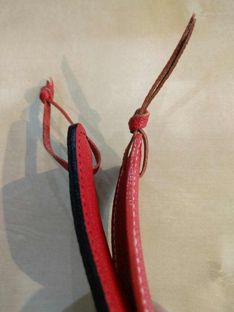 ステッチは黒く、エッジも黒く塗り赤備えの甲冑をイメージしました。