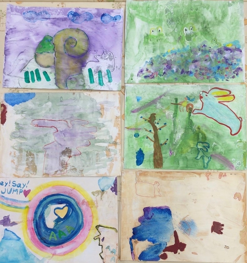 「絵の具の染みを見つめて、何かが見えてきたら、そこから絵を作っていこう」というお題。実際に、ジュエルっ子の絵の中に、そうやって描いたものが何枚かあります。