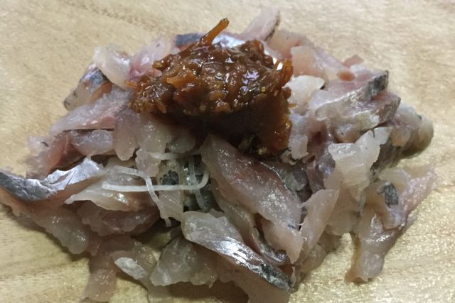 ▲アジと「ぜんの辛んま」を包丁でたたいて、なめろう風