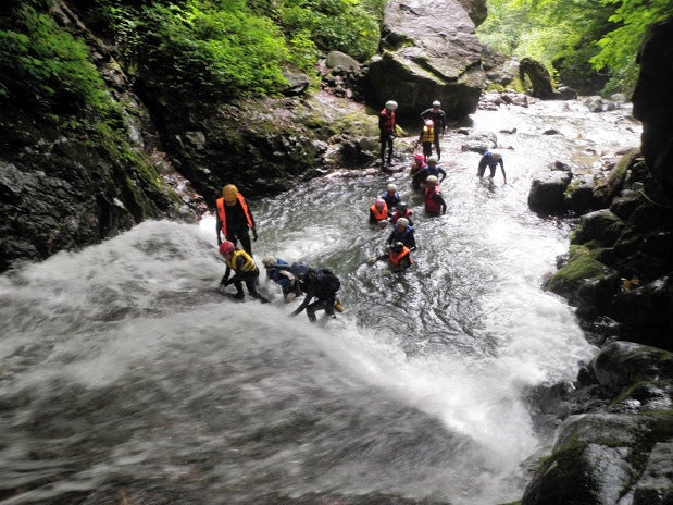 ▲マイナスイオンあふれる沢でのシャワークライミング。