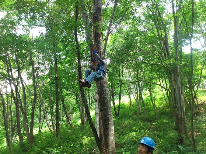 ▲特殊な遊具とロープワークを用い、木に登るだけでなく様々な冒険をします。