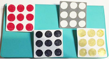 ブローチはおおよそ4cm角で白地に金、赤、クロとグレー地に白ドットの4パターンです。