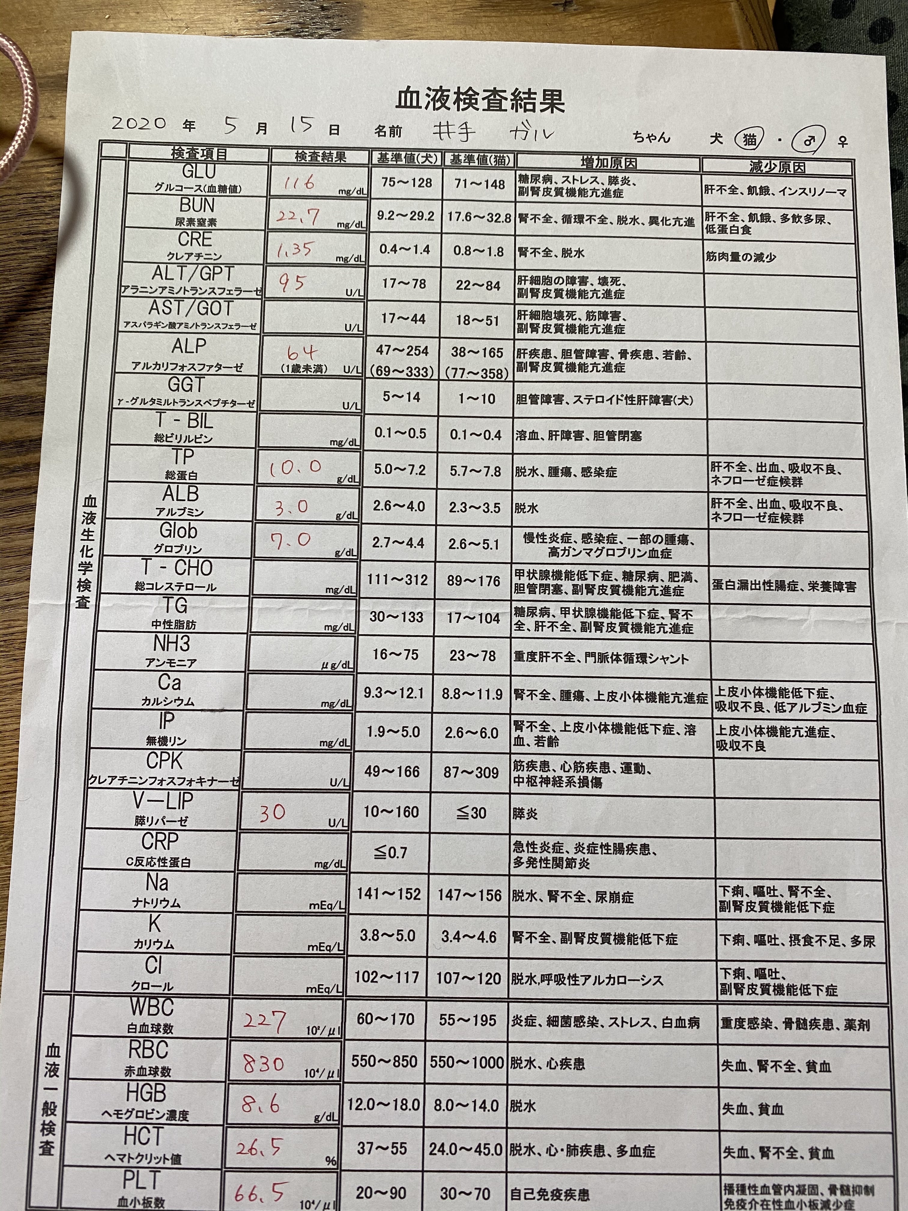 5/15の病院内での血液検査結果の正しいものを投稿させて頂きます。
