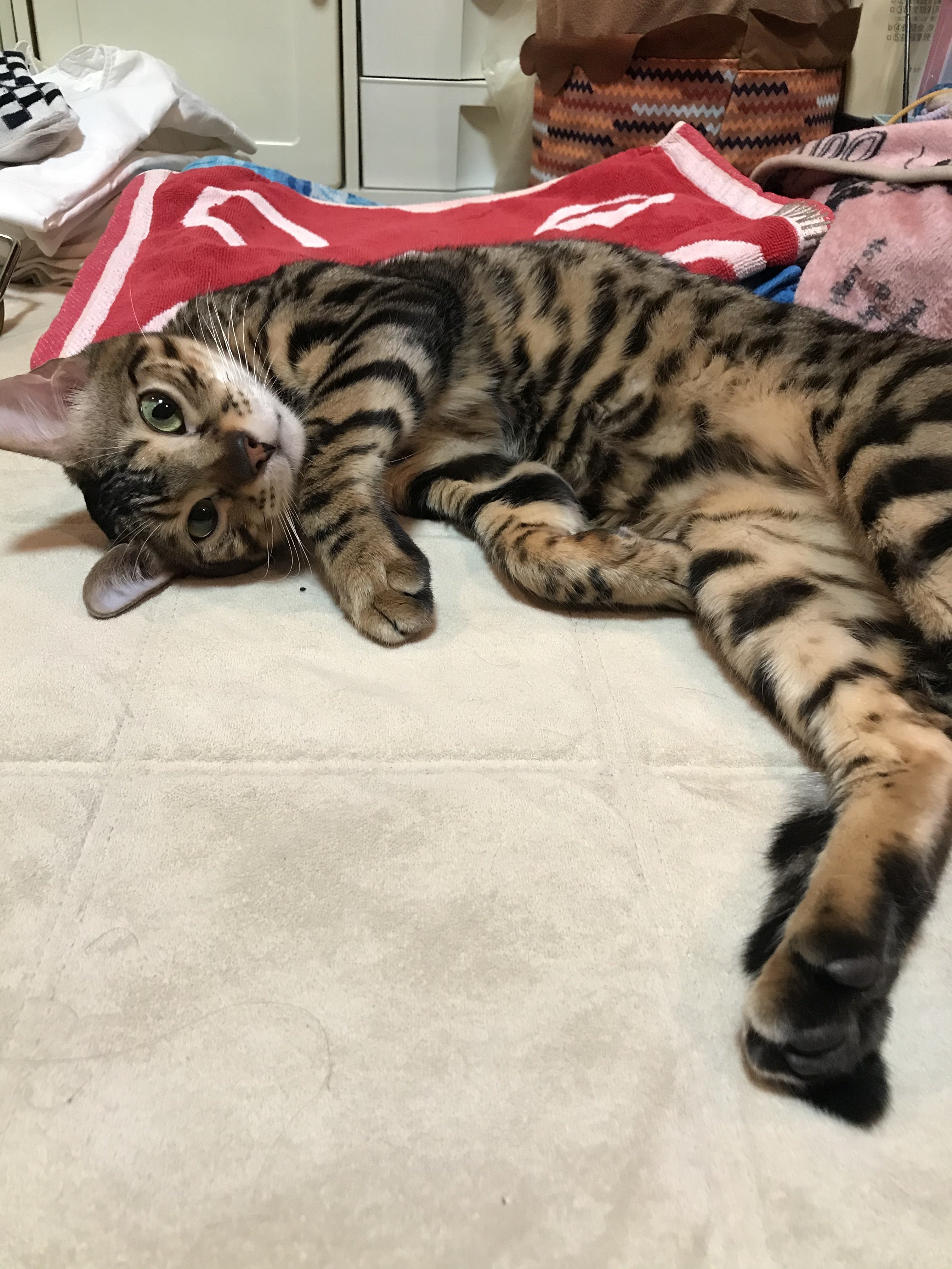 開始早々沢山の方に支援して頂き心から感謝申し上げます。不慣れなため手際が悪く申し訳ございません。今回はガルのこれまでの経緯をお伝えしたいと思います。本文でお話したことと重なる内容もございますが、読んで頂ければと思います。ガルが体調を崩したは4月中旬頃でした。今まで食欲旺盛なガルが食事を残すようになり、あまり遊ばなくなりました。餌が飽きてしまったのかと思い色々な餌に変えてみたのですが日に日に餌を食べる量が減って、ついに餌を一口も食べてくれなくなりました。すぐにかかりつけ医に連れていき診察を受けると熱が40℃あり、猫かぜかもとのことで抗生剤と消炎剤の注射、栄養剤、水分補給の点滴受けました。翌日も同じ処方して頂き食欲も戻り安心しましたが、5月1日また餌を食べなくなり、今度はトイレ以外寝てばかりでした。病院に連れて行くとやはり熱が40℃あり注射と点滴の処置をし、その時に先生から伝染性腹膜炎(FIP)の話を始めて聞きました。時期がゴールデンウイークだったこともあり、外部の血液検査ができず5月6日まで毎日注射などの処置のため病院に通いました。連休明けの5月7日、ようやく血液検査を受け結果は1週間後。結果を待つ1週間、なんでうちのガルがこんな事になってしまったのか、大事に育ててきたつもりでしたが何か足らなかったのか胸が押し潰される思いでした。何故ならFIPは致死率99.9と言われていたからです。早い子で10日、遅い子でも半年もつかどうかと伝えられました。今の日本には緩和ケアしかしてあげれないと先生に言われ頭が真っ白になり言葉も出てきませんでした。どうかガルがFIPでありませんように...祈るように結果を待ち、5月14日無情にもFCoV抗体価400倍~1600倍で陽性反応が出てしまいました。。この段階ではまだ100%FIPではないものの、8割がたFIPでしょうからどのように緩和ケアしていくか検討しましょうとの事でしたが、どうしてもガルのことを助けたい、何か手はないのかあらゆる検索をし、同じ病気の猫ちゃんがいる方のブログなどを読み漁りようやく日本では未認可の薬があることを知りました。この薬を取り扱ってる協力動物病院は日本に6か所しかなく、運が良い事に我が家から車で50分ぐらいの所にありました。すがる思いですぐに電話したところ本来予約診療なのですが、すぐに診て頂けるとの事で直ちに向かいました。採血、エコー、触診などして頂き遺伝子検査(外部)をし,やはりFIP暫定との事で薬を処方して頂きました。ガルの場合FIPドライタイプで体重1kgにつき100mg、この時点でガルはなりました。300gそれに加えFIPドライタイプは1.3倍を与えるため500mgの投与となりました。ガルを助けられるとほっとしましたが、次に課題になるのは金銭面のことでした。100gあたり2400円、ガルの投薬は500mgなので1日12000円、これを84日続けます。途中体重増加するたびに薬の量が増えていくため、資金をどうするか家族で沢山話し合いました。要介護の儀父母抱え、そちらの面倒もみなくてはいけないため、仕事を増やす事も出来ず困っていたところ友人にこちらのクラウドファンディングを勧められました。本来は私達家族が捻出しなければいけない資金で非難されても仕方ないのですが、こうやって沢山の方が暖かい手を差し伸べてる下さり涙が出るほど嬉しいです。本当にありがとうございます。大変長文になりましたが、今後ともガルの応援よろしくお願いいたします。次回5/15以降の経過報告させていただきます。