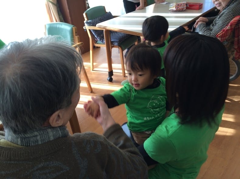 高齢者施設では、赤ちゃんとふれあうことでの癒し効果に加え、ママと話すことで知識の継承にもつながります。