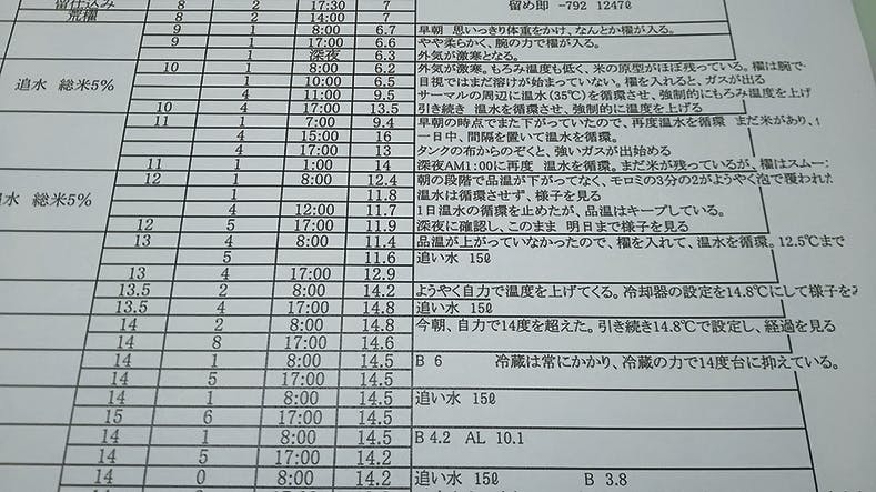 ▲酒造りの先輩や酒類指導官に指導を仰ぎ、自らも日記や経過簿に仕込み経過や課題をつづり、洗米の吸水時間などの原料処理方法、仕込み配合や温度設定など、3年あまりの歳月をかけて理想の酒を目指し日夜研究をしてきました。
