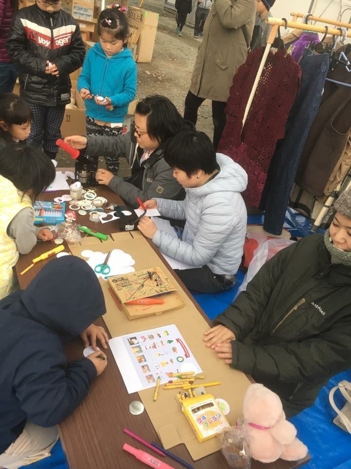 <リターンの缶バッジをつくる作業をこどもたちと>
