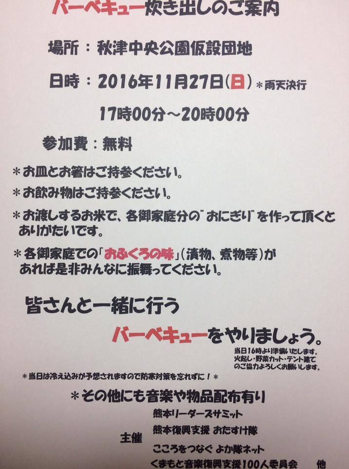 熊本の秋津仮設団地では、熊本復興支援おたすけ隊の原田さんや、熊本リーダーズサミット(避難所の中でリーダーとして動いていた人や、復興支援をおこなっている熊本の人たちでつくったコミュニティ)が中心になって、今日11月27日の17時から炊き出しがおこなわれます。