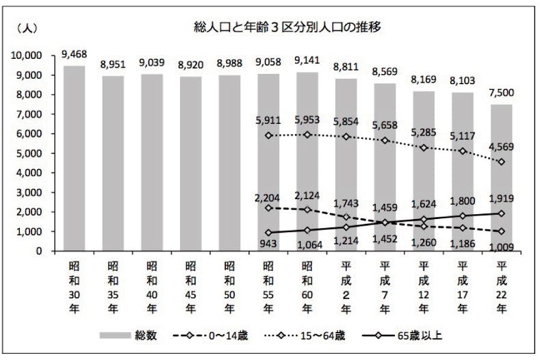 ▲しかし、やはり少子高齢化はとまりません。(甲良町「まち・ひと・しごと創生 甲良町人口ビジョン・総合戦略」(平成28年2月)より)