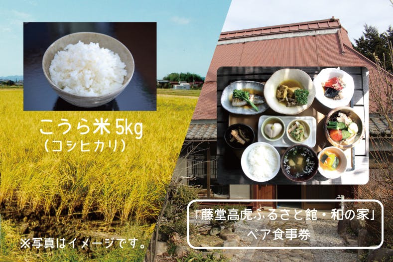▲5,000円のご支援をいただきました皆様には、「藤堂高虎ふるさと館・和の家」のペア食事券と、甲良米5kg(コシヒカリ)をお届けいたします。