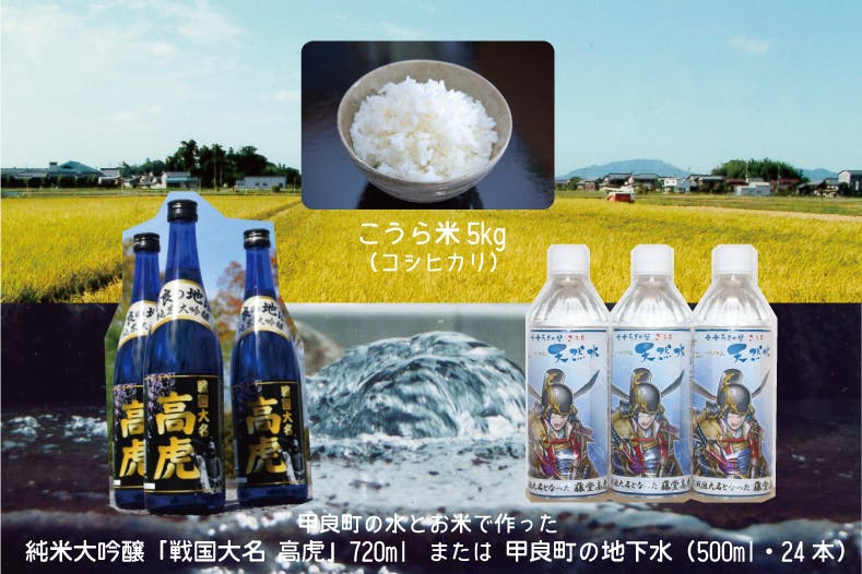 ▲10,000円のご支援をいただきました皆様には、甲良米5kg(コシヒカリ)と、甲良米で作られた地酒「純米大吟醸 戦国大名 高虎」(720ml)または甲良町の地下水500ml×24本(藤堂高虎オリジナルラベル)をお届けいたします。