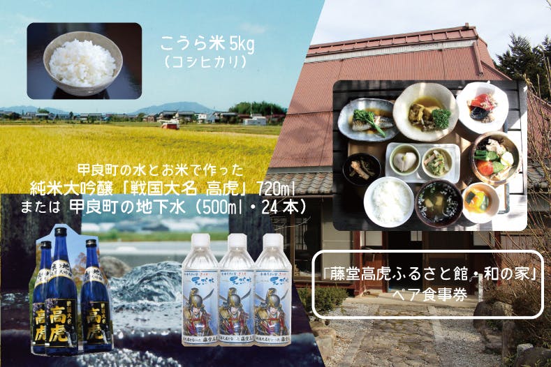 ▲15,000円のご支援をいただきました皆様には、「藤堂高虎ふるさと館・和の家」のペア食事券と、甲良米5kg(コシヒカリ)、そして甲良米で作られた地酒「純米大吟醸 戦国大名 高虎」(720ml)または甲良町の地下水500ml×24本(藤堂高虎オリジナルラベル)をお届けいたします。