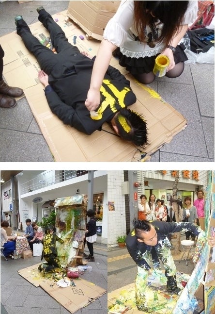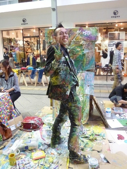 なぜか背中に「低燃費」を背負い・・・絵具とペンキにまみれ黙々と絵を描く男。異様な光景に周りには人だかりができ、みなさん物珍しそうに写真やムービーを撮っていらっしゃいました。