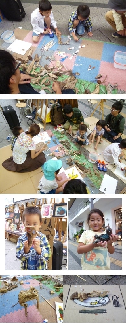 好きな形の流木を選んで、どれとどれをくっつけるか考えて、色を塗って目玉を付けて・・・。子どもたちは流木の形に興味津々!とっても真剣でした。大人が考えるよりも上手に形を組み合わせる子どもたち。本当に自由で生き生きとした感性に、ただただ感心するばかり。