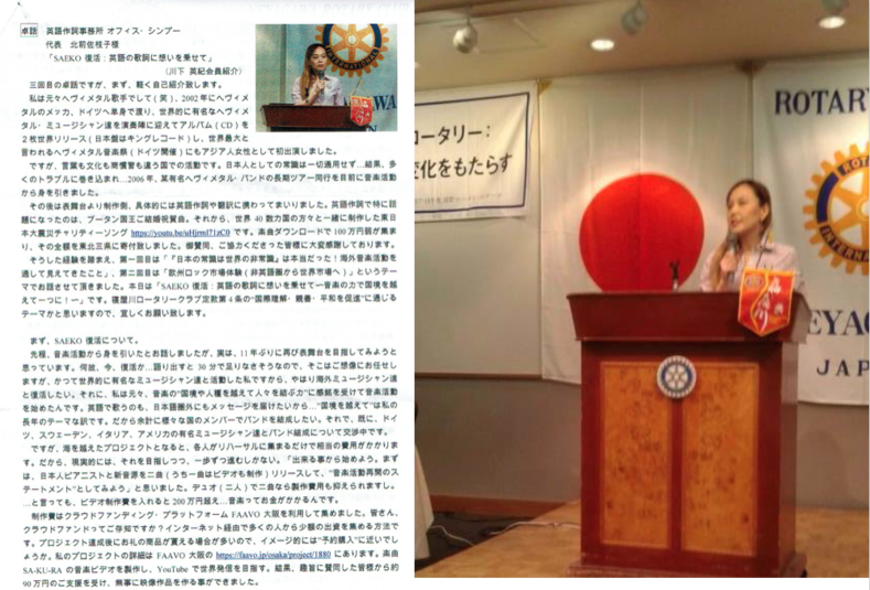 そうした経験を踏まえ、第一回目は「『日本の常識は世界の非常識』は本当だった!海外音楽活動を通して見えてきたこと」、第二回目は「欧州ロック市場体験(非英語圏から世界市場へ)」というテーマでお話させて頂きました。本日は「SAEKO復活:英語の歌詞に想いを乗せて~音楽の力で国境を越えて一つに!~」です。寝屋川ロータリークラブ定款第4条の“国際理解・親善・平和を促進”に通じるテーマかと思いますので、宜しくお願い致します。