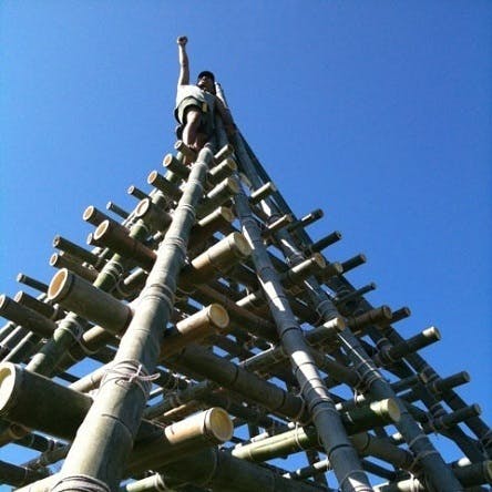 ▲大人が乗っても大丈夫! 巨大「竹ジャングルジム」