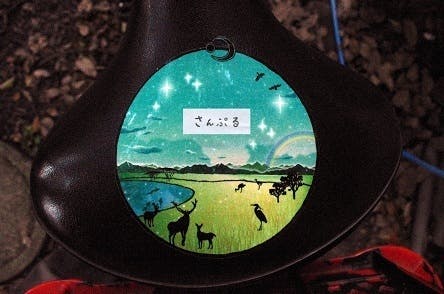 ●【オリジナル・ステッカー】宮崎の色をイメージしたステッカーです。【およそ10cm×10cm】ただの、円型ではなく、月と太陽が入った部分はその形状のまま切り抜いた、こだわりの逸品です。車をお持ちでない方は、この写真のように、自転車のサドルにも貼れます!