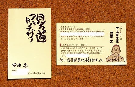 ●【名刺をデザイン】 主催者作家が「あなたの名刺」をデザインします。上記写真のように「書」「似顔絵」などを取り入れることも可能な限り対応します。ただし、印刷代は別途実費が必要になります。インターネット上にある格安の印刷会社に発注予定(プリントパック、graphic、マヒトデザインなど)。詳細は、作品制作の際にお尋ねください。